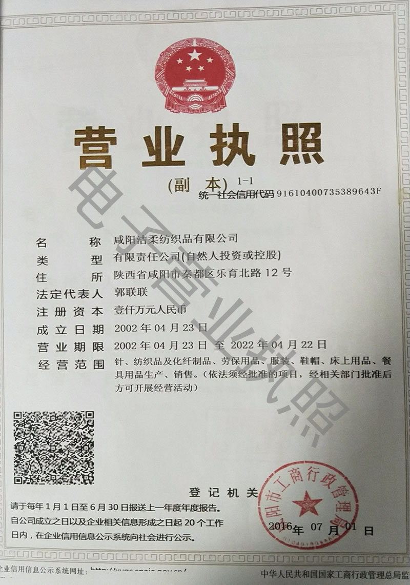 咸陽(yáng)潔柔紡織品有限公司網(wǎng)站開(kāi)通了,歡迎各位新老客戶(hù)瀏覽訪(fǎng)問(wèn),我們將竭誠(chéng)為您提供優(yōu)質(zhì)的服務(wù),咨詢(xún)電話(huà):13991000367!